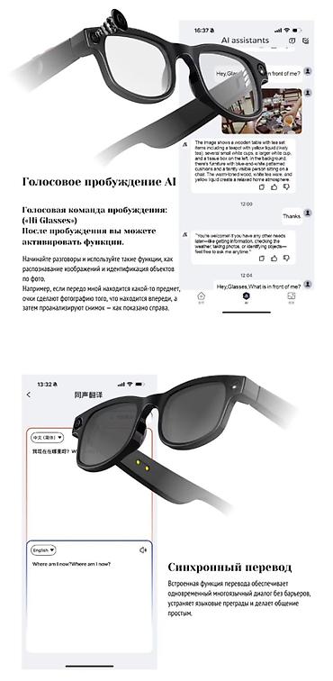 Очки оснащены 8-мегапиксельной камерой с отличным качеством съёмки. Благодаря встроенным динамикам вы получаете чистый и насыщенный звук, а технология AI wake-up позволяет управлять устройством голосом. Поддержка Wi-Fi делает использование ещё удобнее — можно мгновенно передавать файлы и оставаться онлайн.